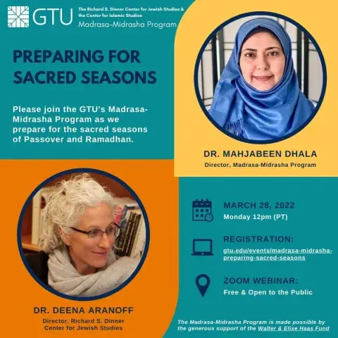 Please join the GTU's Richard S. Dinner Center for Jewish Studies Program Director Dr. Deena Aranoff and Madrasa-Midrasha Program Director Dr. Mahjabeen Dhala in preparation for Passover and Ramadhan.