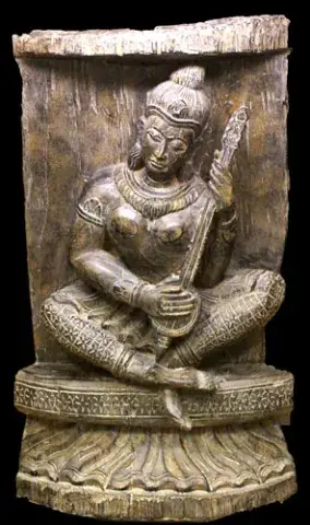 At right, Saraswati, the Hindu goddess of knowledge, music, arts, wisdom and learning.
