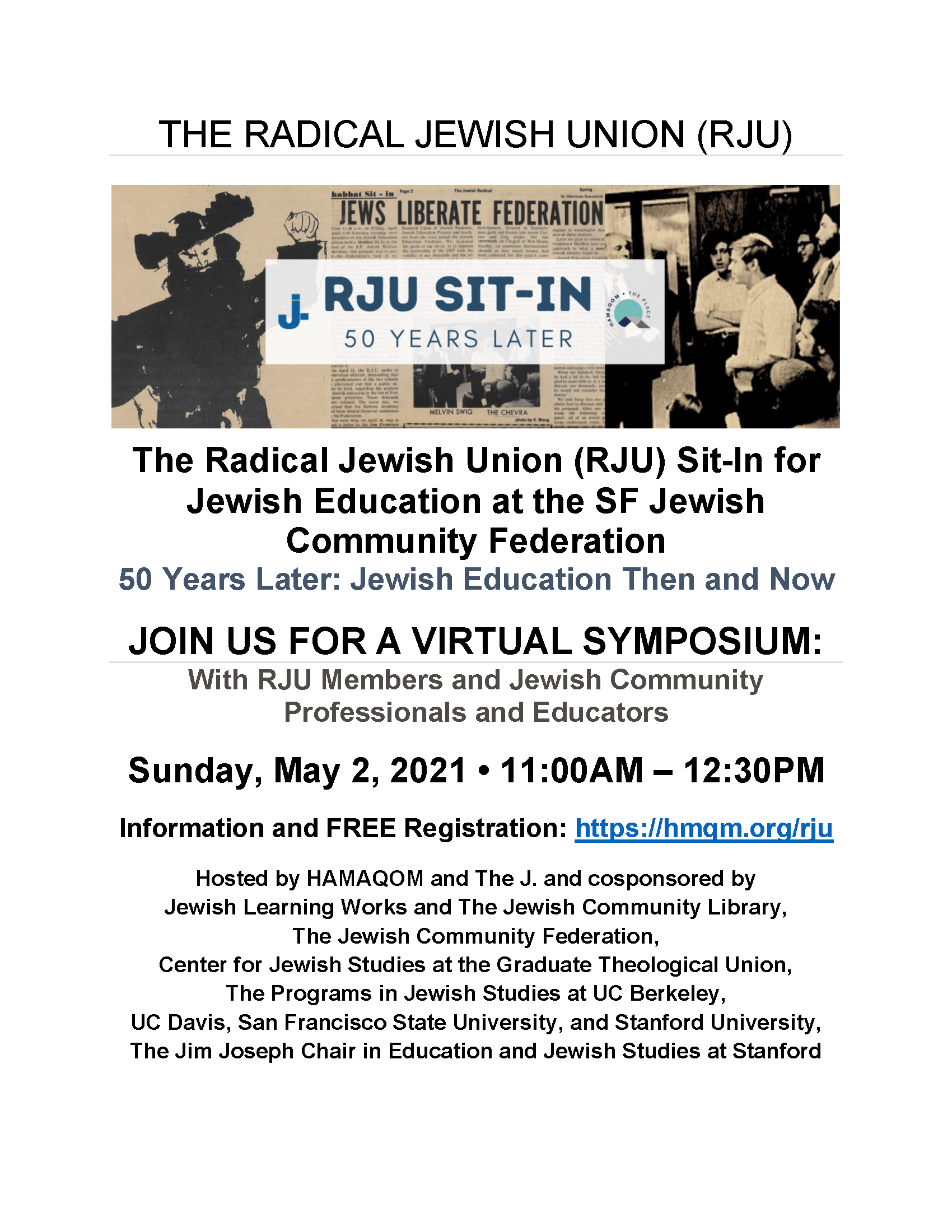 Nearly 50 years ago, the members of the Berkeley-based Radical Jewish Union (RJU) staged a Sit-In at the Jewish Community Federation in San Francisco to advocate for much more robust community support of Jewish Education. The 50th anniversary of “The Sit-In for Jewish Education” will serve as the springboard for a virtual program that will encompass major developments in the field over the past 50 years (specifically in the Bay Area Jewish community, but also in the US in general and in Israel) and some reflections about future trends.