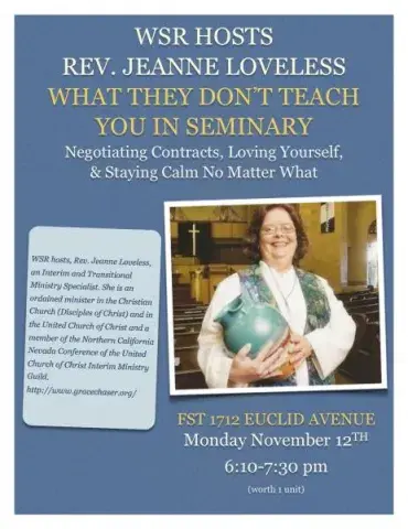 Mon, 12 Nov 2012 - 18:10 Image Rev. Jeanne Loveless “What They Don’t Teach You In Seminary: Negotiating Contracts, Loving Yourself, & Staying Calm No Matter What” Franciscan School of Theology, 1712 Euclid Avenue, Berkeley (1 unit) click on image for flyer.