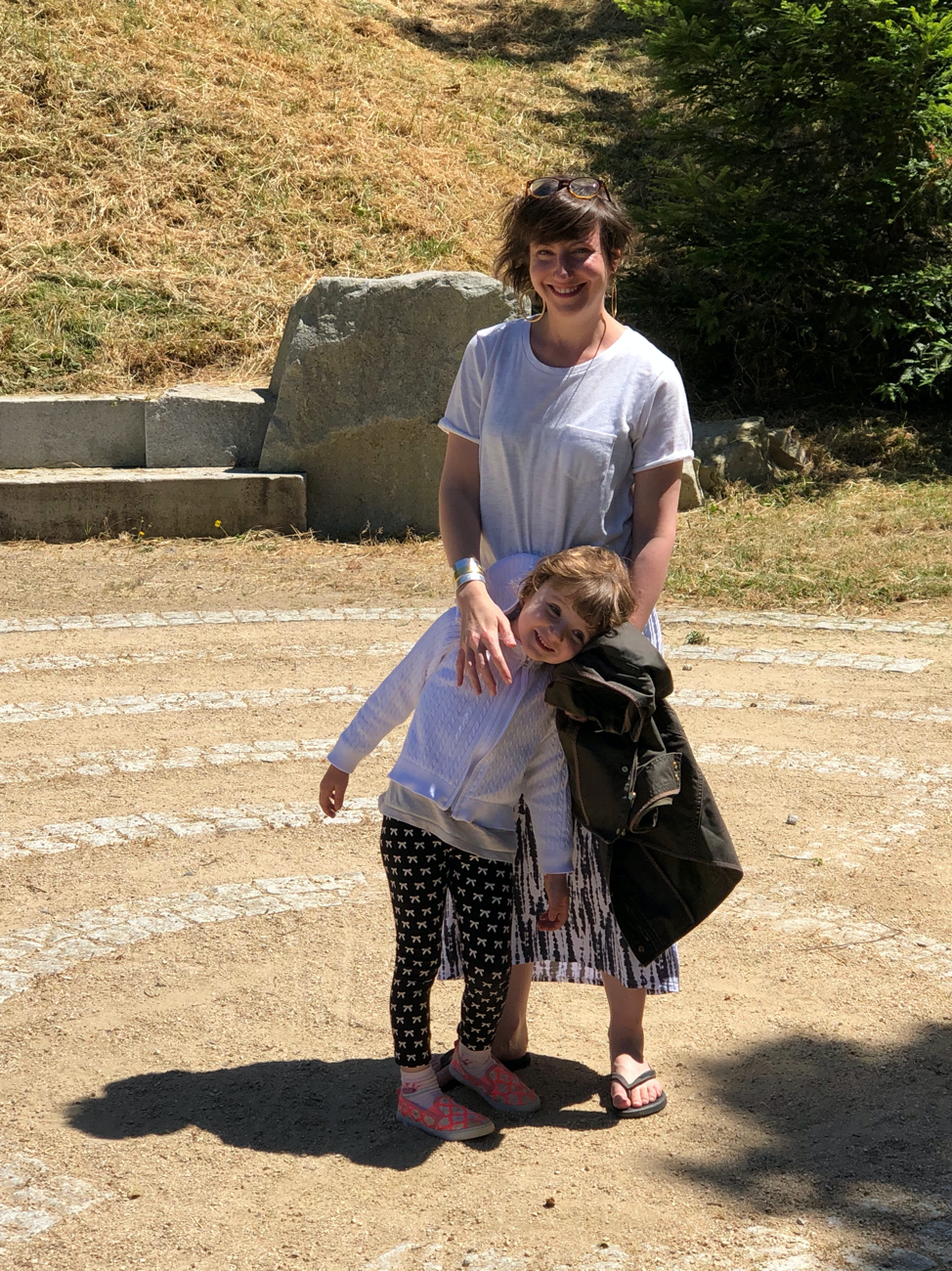 Electra & I in the center of a labyrinth, thinking about how we can share the joy on our outward journey