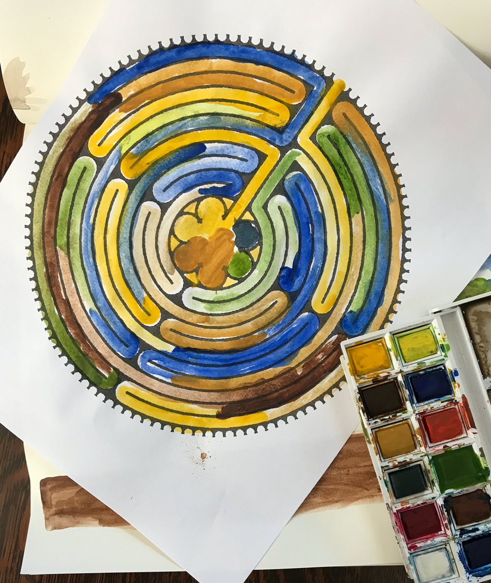 Labyrinths, whether made of stone, turf, or ink on paper, tend to be “thin places”, a concept originating through Celtic traditions. The phrase is used to describe sacred places where the time and distance between this world and the next seems to dissolve; spaces that invite encounter and connection. The ancient practice of tracing a labyrinth can help us find a moment of peace and solace in times of mourning, difficulty, and crisis.