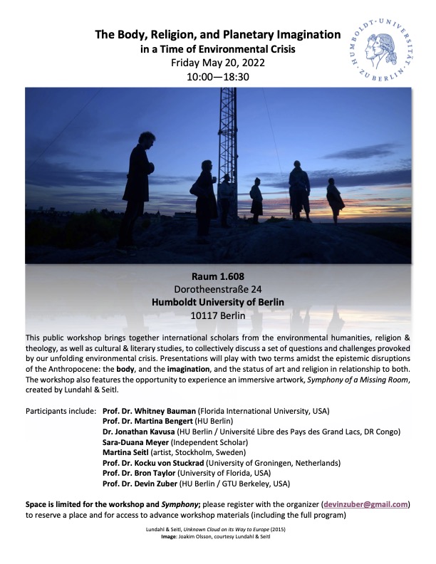 In addition to Dr. Zuber and the artists Christer Lundahl and Martina Seitl, presenters include Dr. Whitney Bauman (Florida International University, USA), Dr. Kocku von Stuckrad (University of Groningen, Netherlands), Dr. Martina Bengert (Humboldt University of Berlin), Dr. Jonathan Kavusa (Humboldt University of Berlin / Universite Libre des Pays des Grand Lacs, Goma / DR Congo), Dr. Bron Taylor (University of Florida, USA / Rachel Carson Center, LMU), and more.