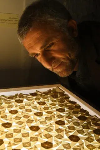 Reverberating Echoes: Contemporary Art Inspired by Traditional Islamic Art, curated by Carol Bier (Visiting Scholar, Center for Islamic Studies), presents work by seven artists of diverse backgrounds, who share a common source of inspiration in Islamic visual culture. Chris Palmer folds single sheets of silk into intricate patterned displays, drawing from both Islamic geometric motifs and Japanese paper-folding tradition; Nazanin Hedayat Munroe reflects on her Persian heritage with an installation about poetry and destiny; and Manzar Rassouli’s featured works demonstrate her shift from highlighting beauty to breaking with tradition. Some visitors are fascinated by Phil Webster’s 3-D printed lamp, while others are moved by the Arabic text in Mamoun Sakkal’s commercial prints. Guests are drawn to Nathan Voirol’s stunning textiles and drawings, and to Hooman Koliji’s light-filled architectural drawings.
