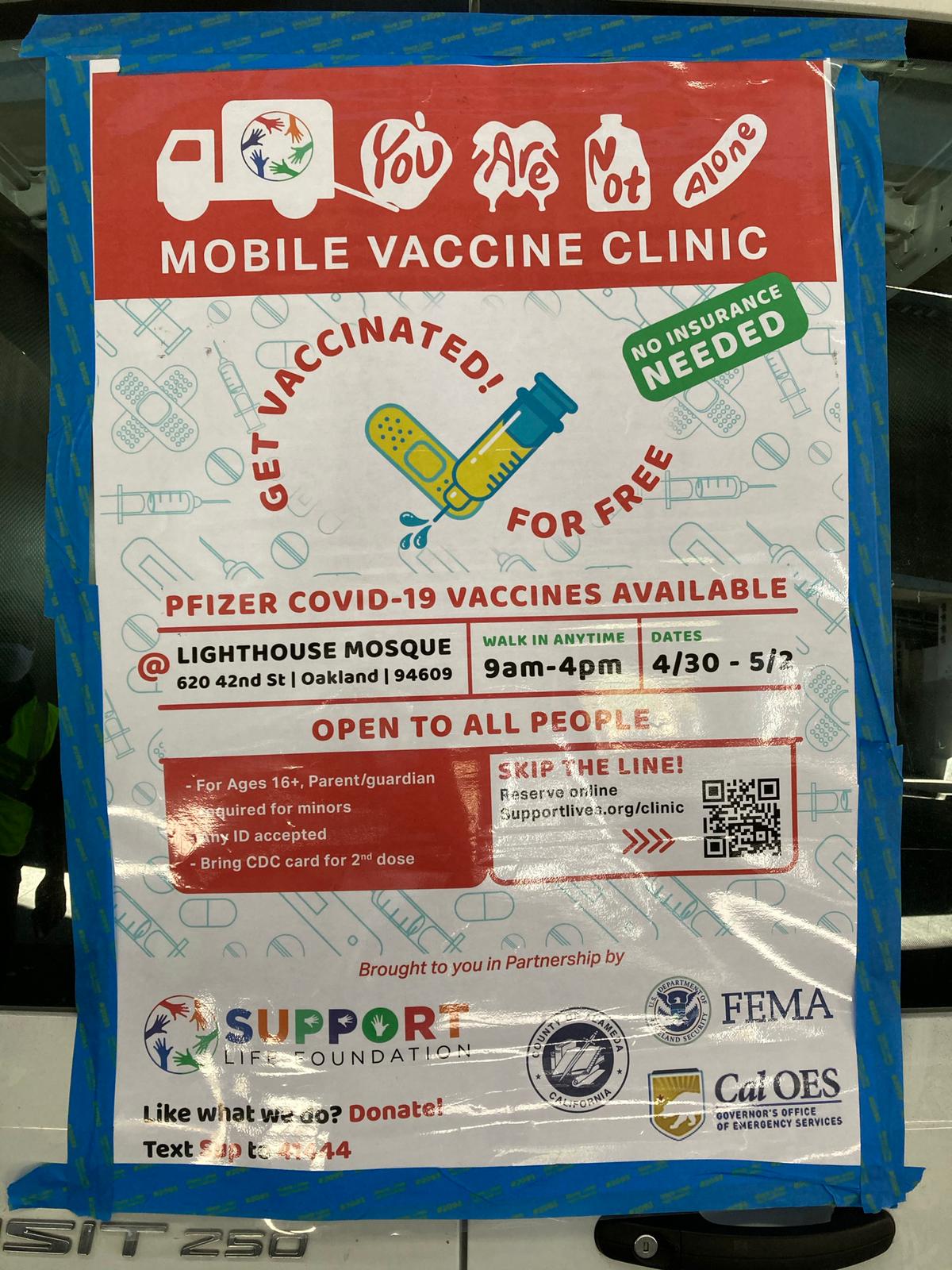 In addition, we recently partnered with many local organizations, including the Support Life Foundation and the Native Health Center, for a mobile vaccination clinic set up at the Lighthouse Mosque, and supervised by the County of Alameda.